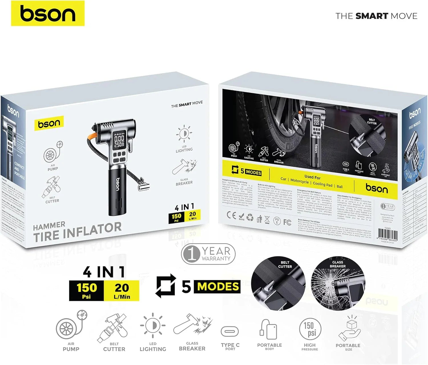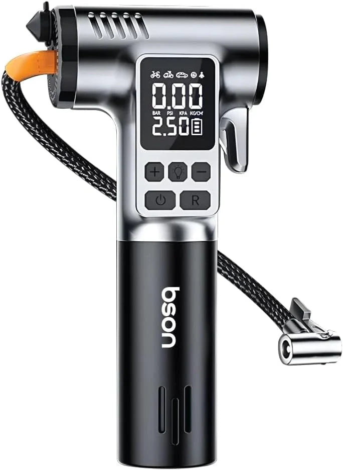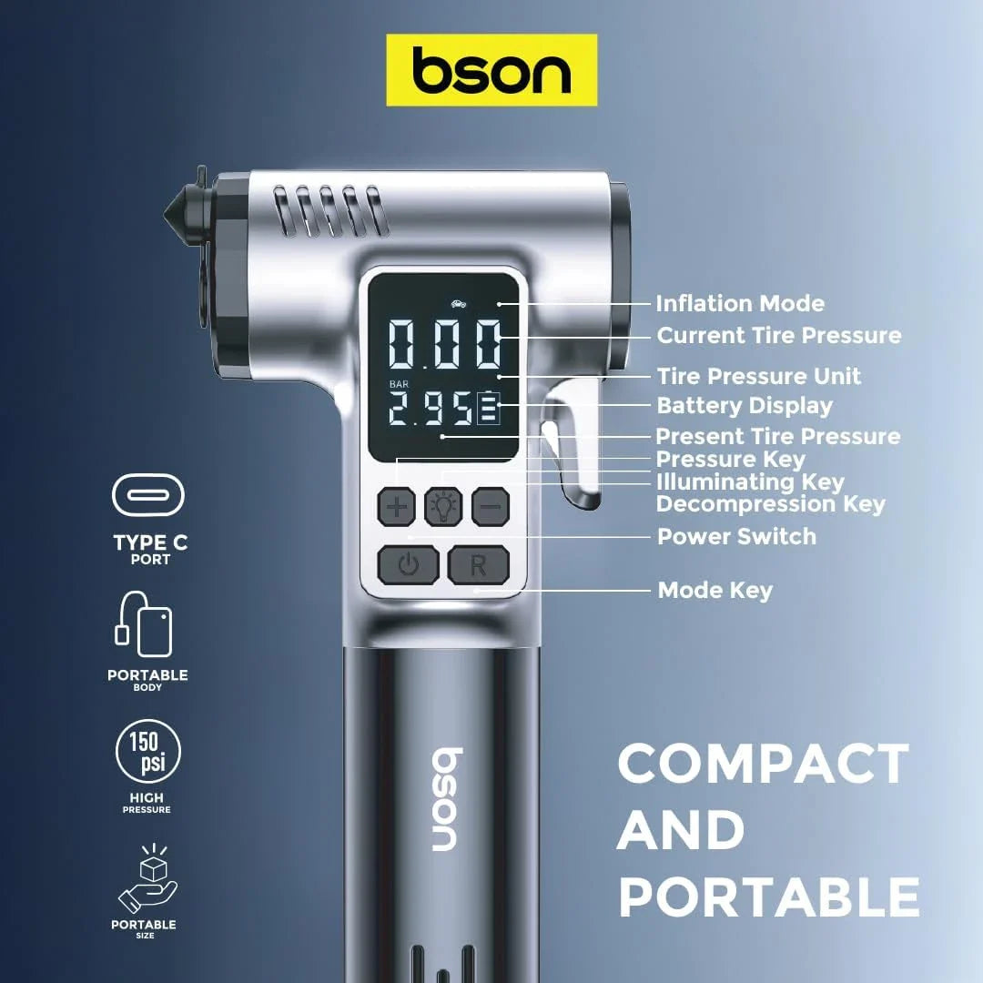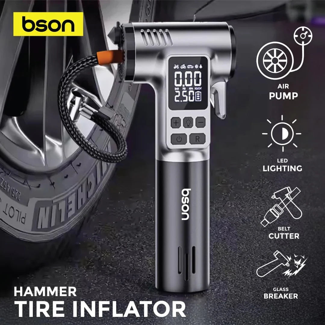 Stay prepared on the road with the Bson Hammer Tire Inflator, a versatile 4-in-1 emergency tool for every driver. Featuring a 150 PSI air pump, LED light, belt cutter, and glass breaker, it’s perfect for roadside emergencies, car maintenance, or outdoor adventures. Type-C fast charging ensures it’s always ready when you need it. Compact, portable, and easy to use, this all-in-one tool keeps you safe and confident on the go.