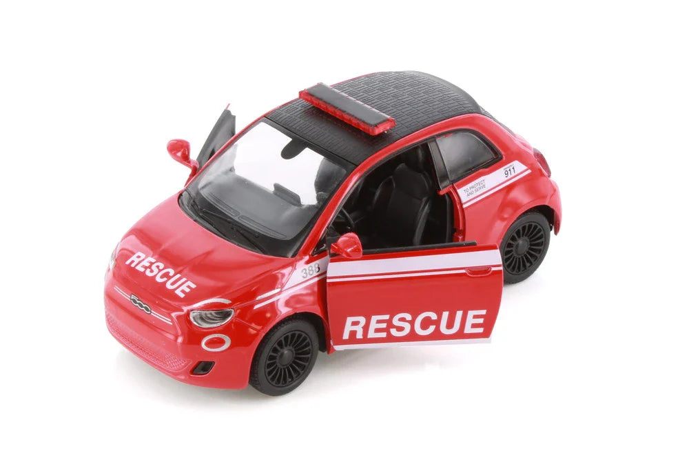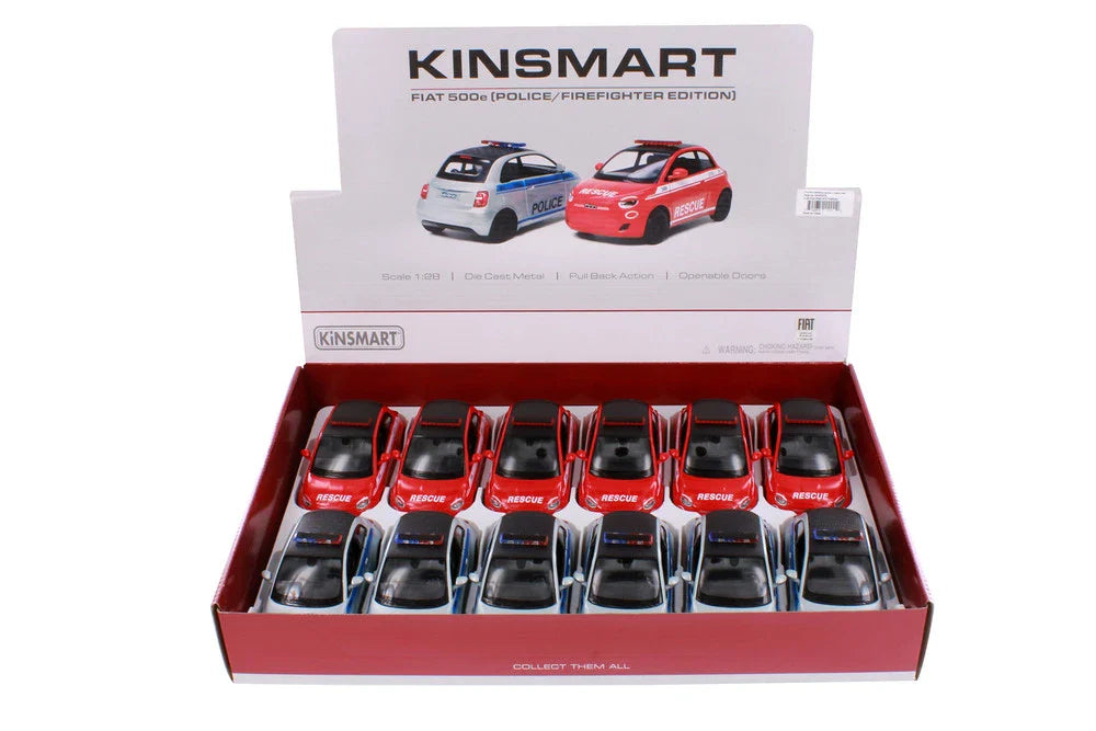 Bring action-packed emergency response to your collection with theKiNSMART FIAT 500e (Police & Firefighter Rescue Edition). This uniquely styled1:28 scale die-cast metal modelreplicates the eco-friendly FIAT 500e, designed withrescue-themed liveries— perfect for pretend play and display.