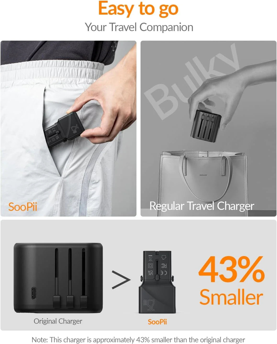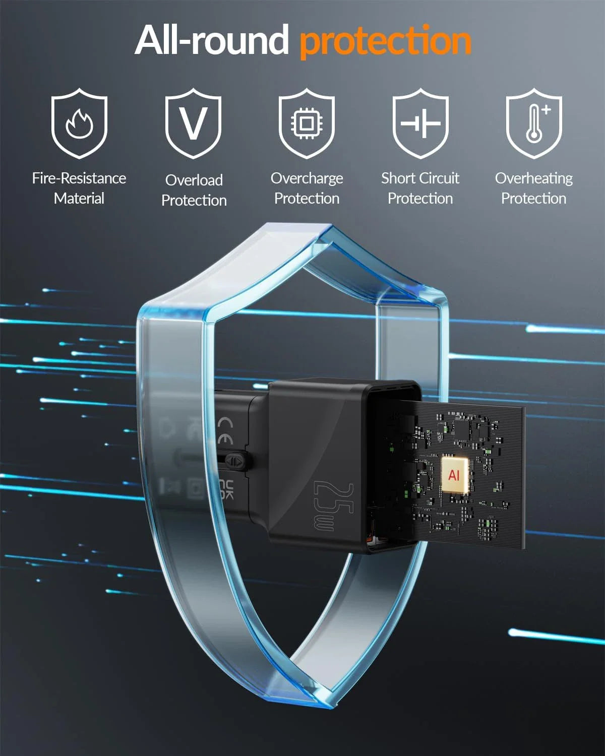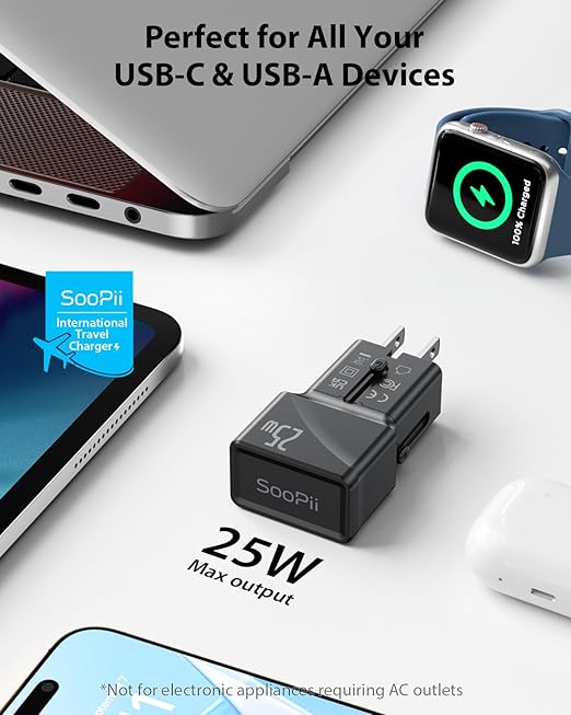 Power up anywhere in the world with the GaN 25W Universal Travel Adapter. Equipped with USB-C PD PPS and USB-A QC fast charging ports, it delivers ultra-efficient charging for iPhone 16/15, Samsung Galaxy S25/S24, iPad, and more. Featuring interchangeable US/UK/EU/AU plugs, this all-in-one GaN charger is compact, lightweight, and built with advanced safety protection. Perfect for business trips, vacations, and daily charging needs — one charger for every destination!