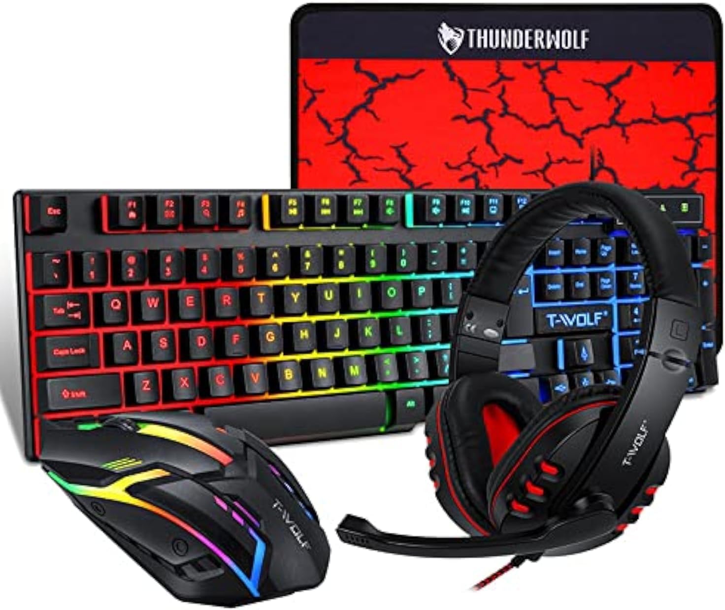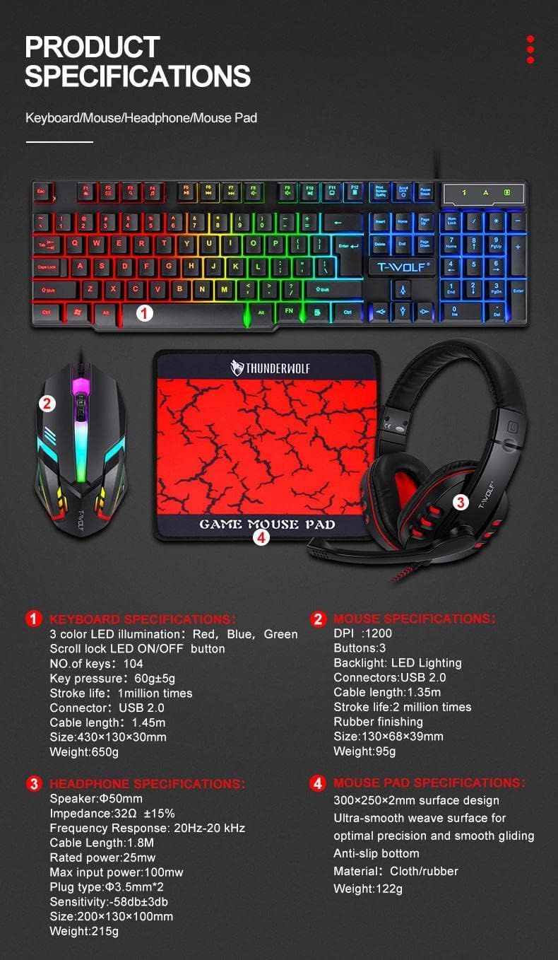 Level up your gaming setup with the T-WOLF 4-in-1 Gaming Combo, featuring a responsive RGB backlit keyboard, precision optical mouse, immersive stereo headset, and smooth mouse pad. Designed for ultimate comfort and control, this combo ensures seamless gameplay and lightning-fast reactions. Perfect for PC gamers who demand performance, durability, and style—all in one complete package.